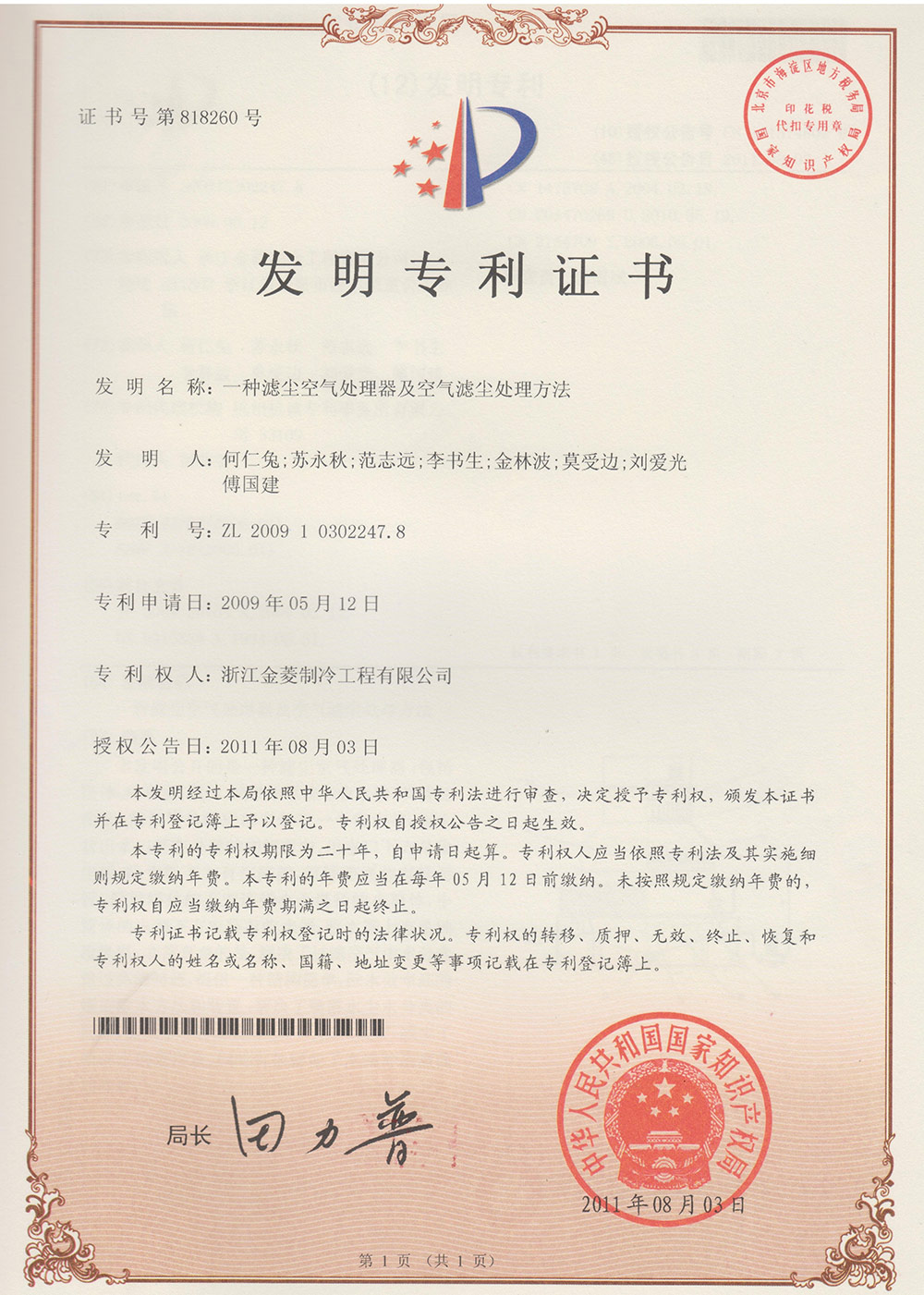 Patent certificate of a dust filter air processor and air treatment method